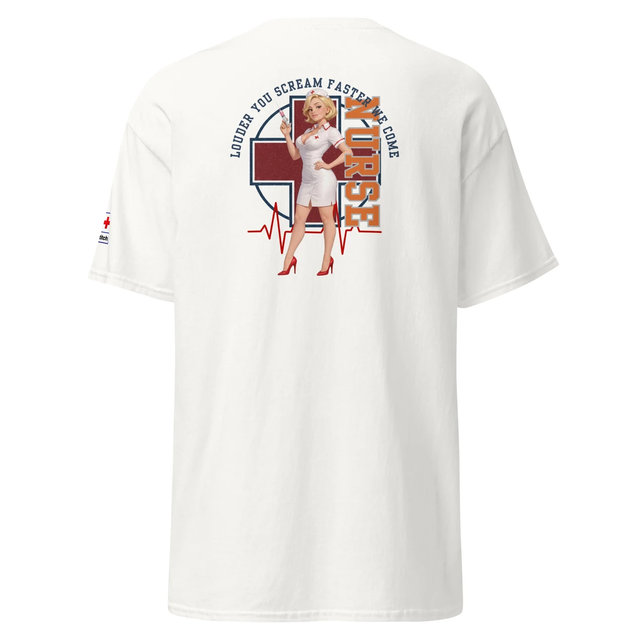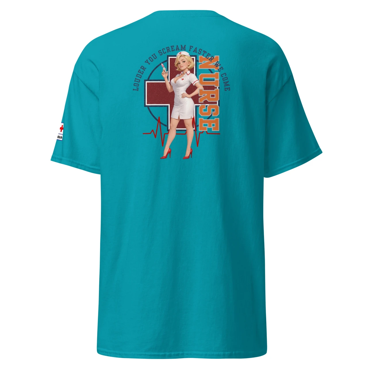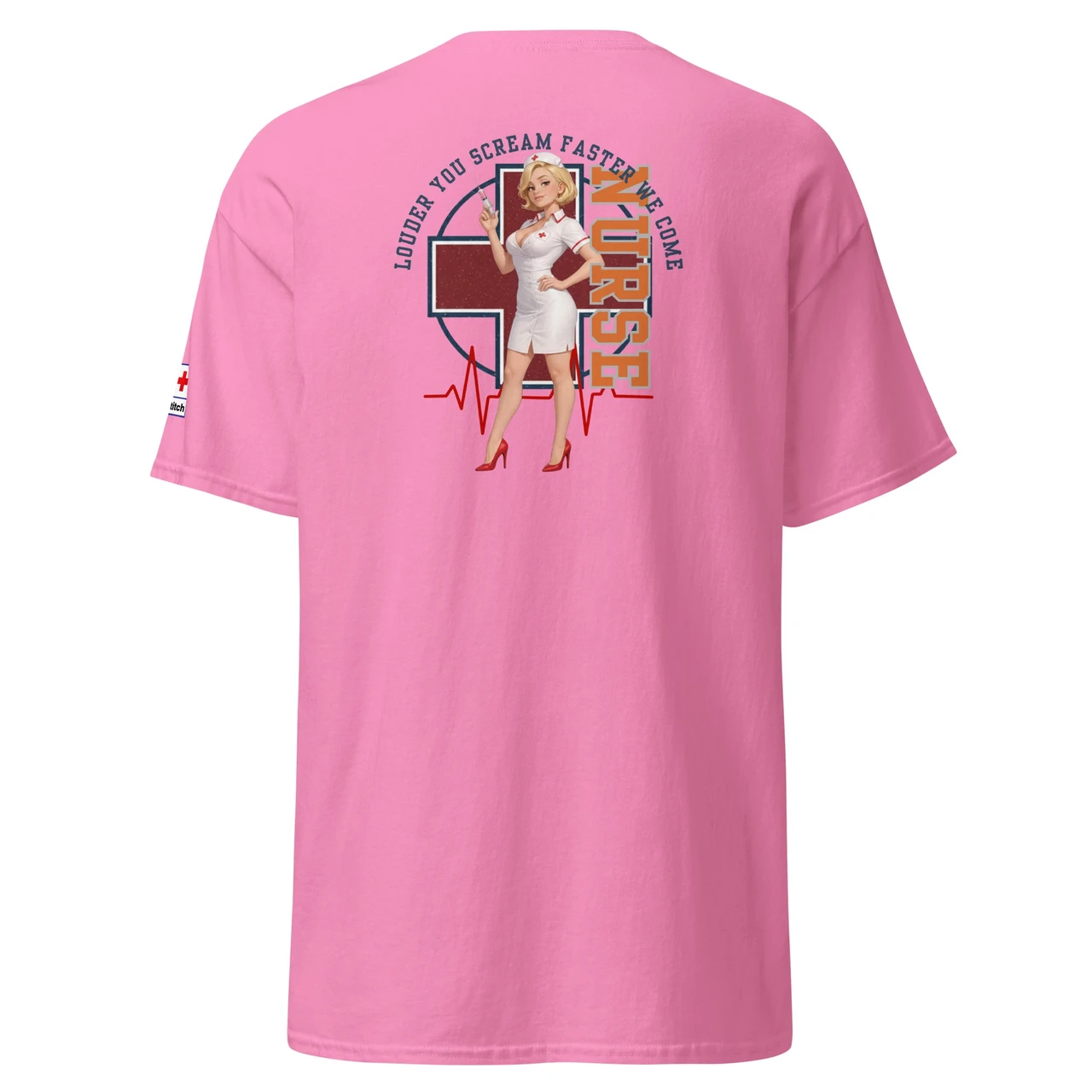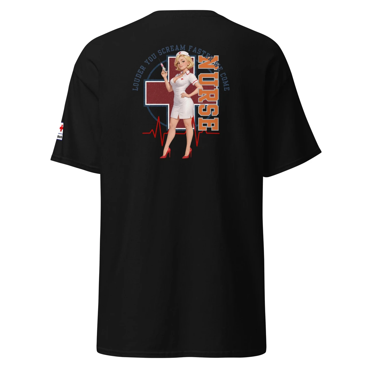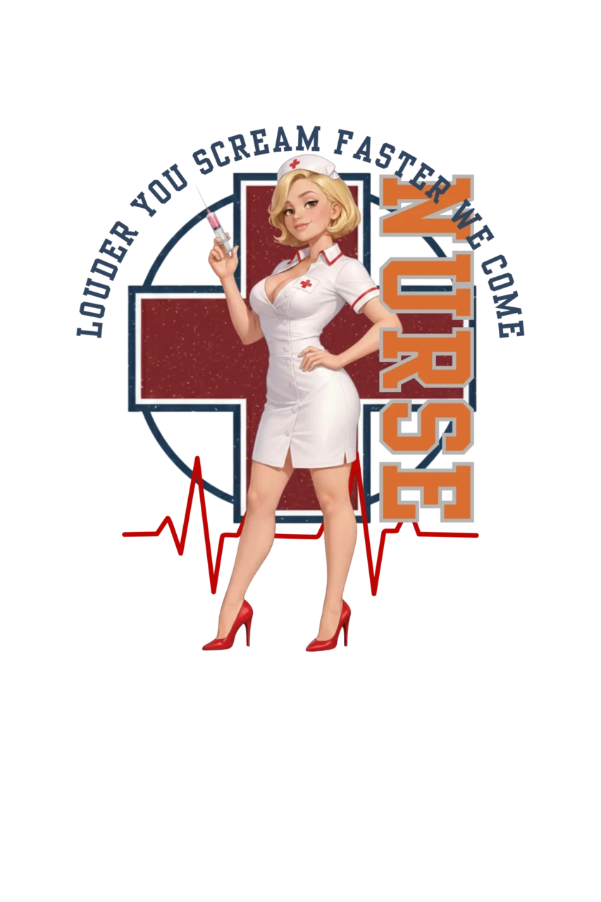 Unikaalne disain: Detailne Pin-Up õe illustratsioon koos süstlaga, mida raamib punane rist, EKG-joon ja jõuline tekst "NURSE".