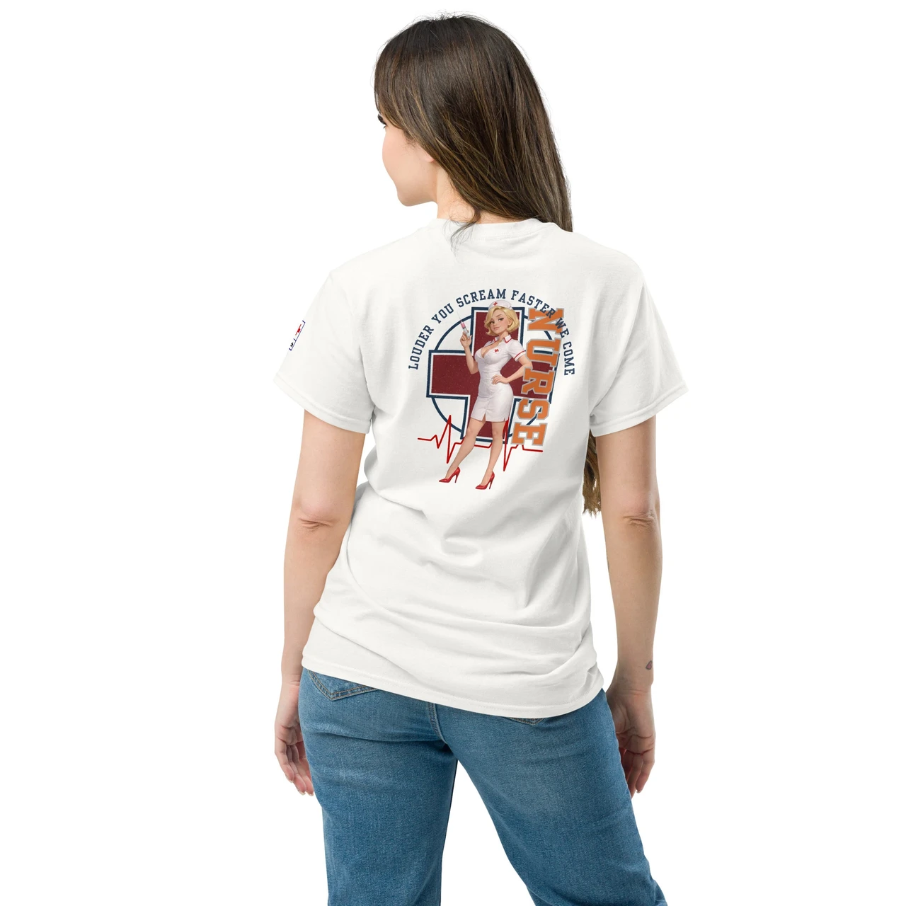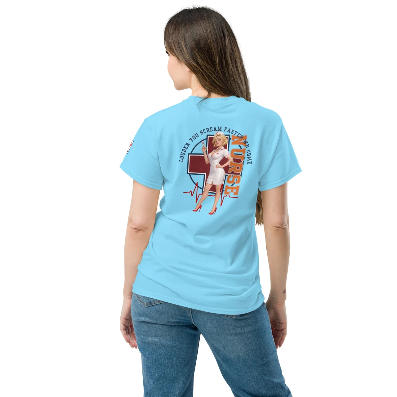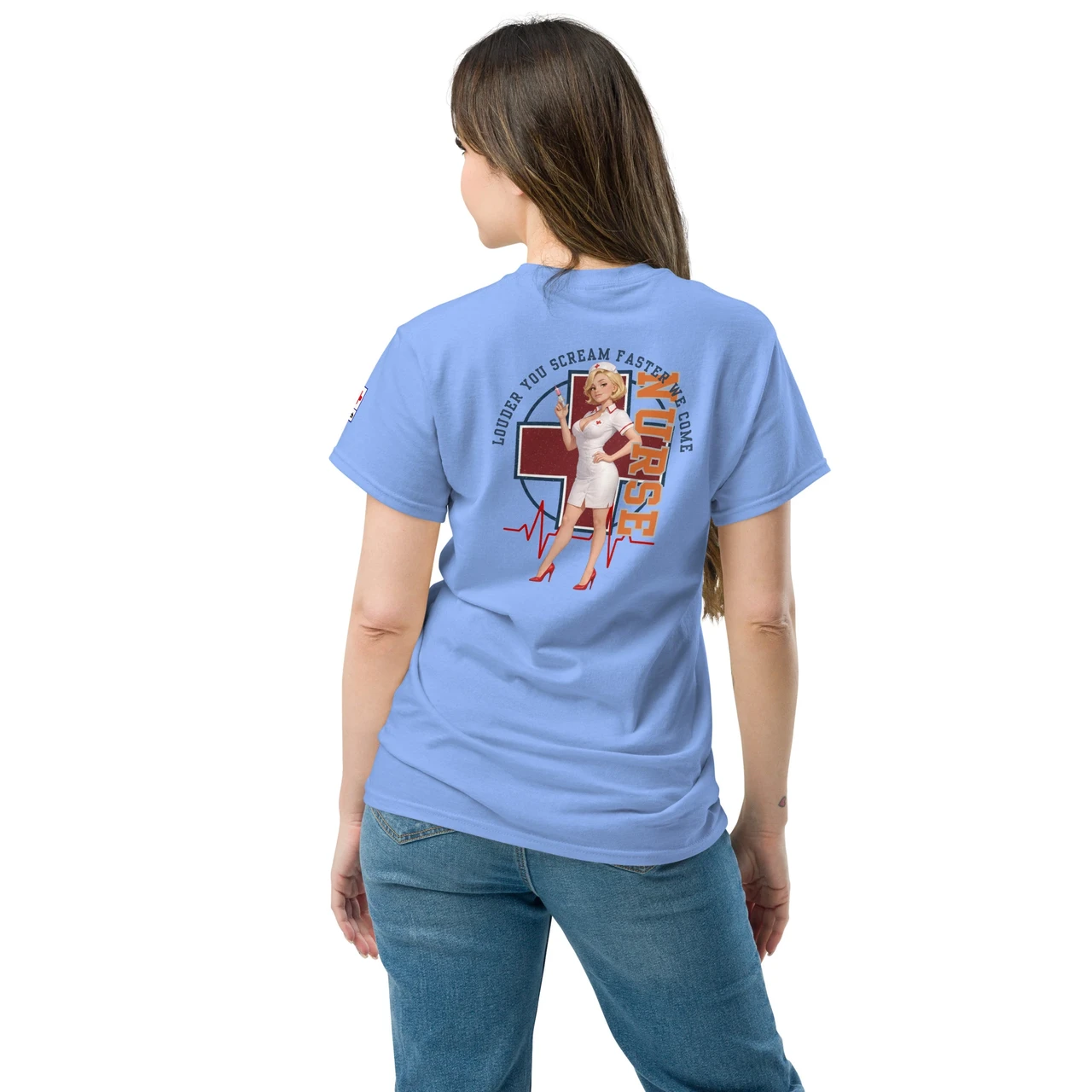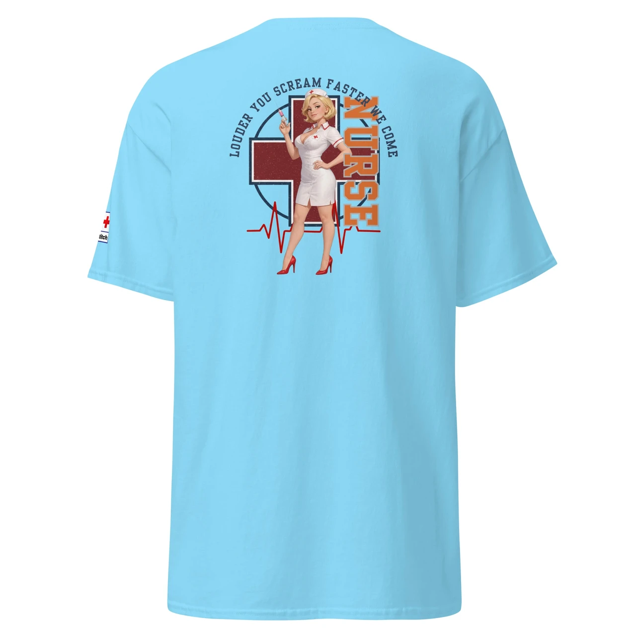 Unikaalne disain: Detailne Pin-Up õe illustratsioon koos süstlaga, mida raamib punane rist, EKG-joon ja jõuline tekst "NURSE".
