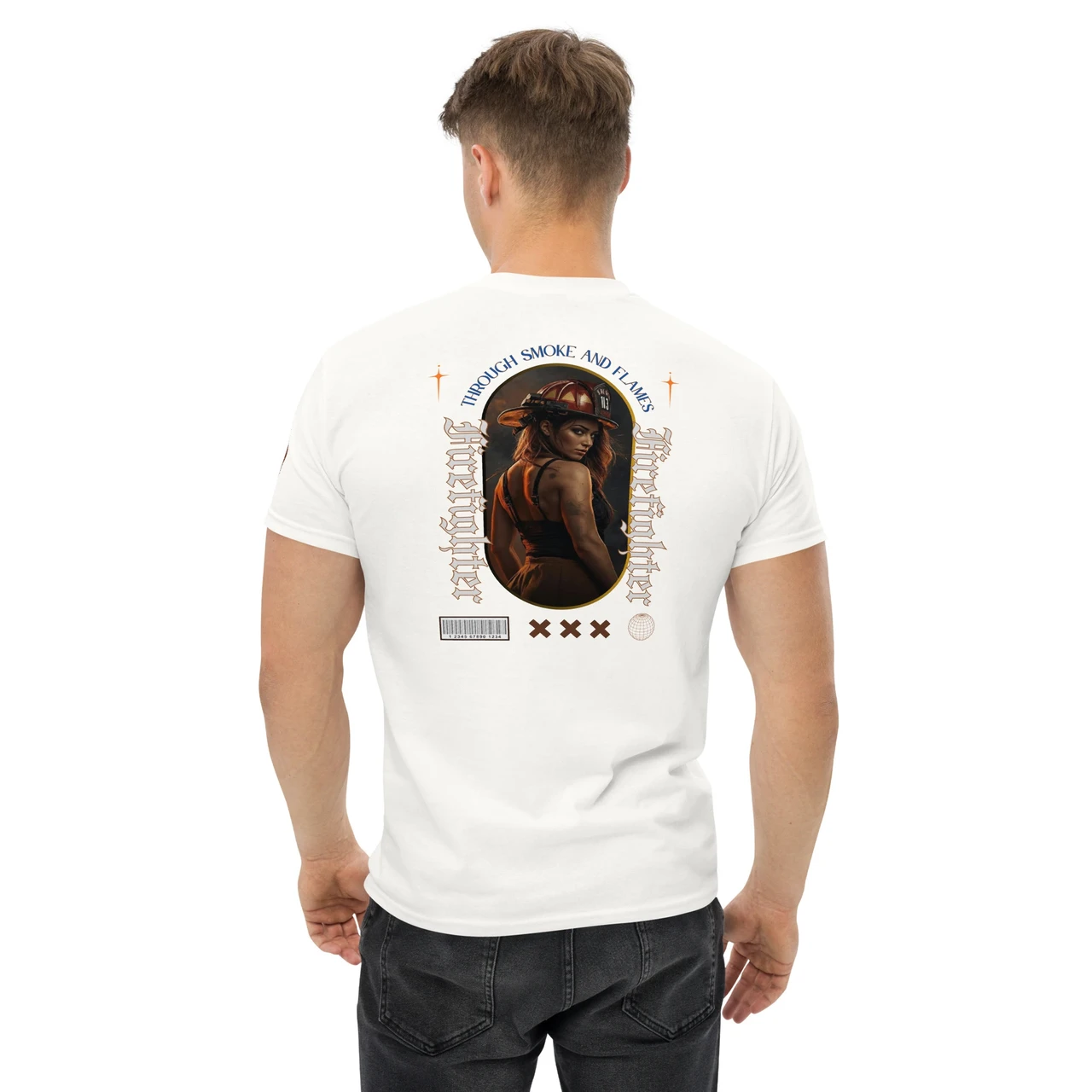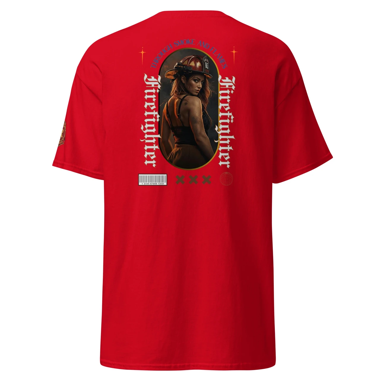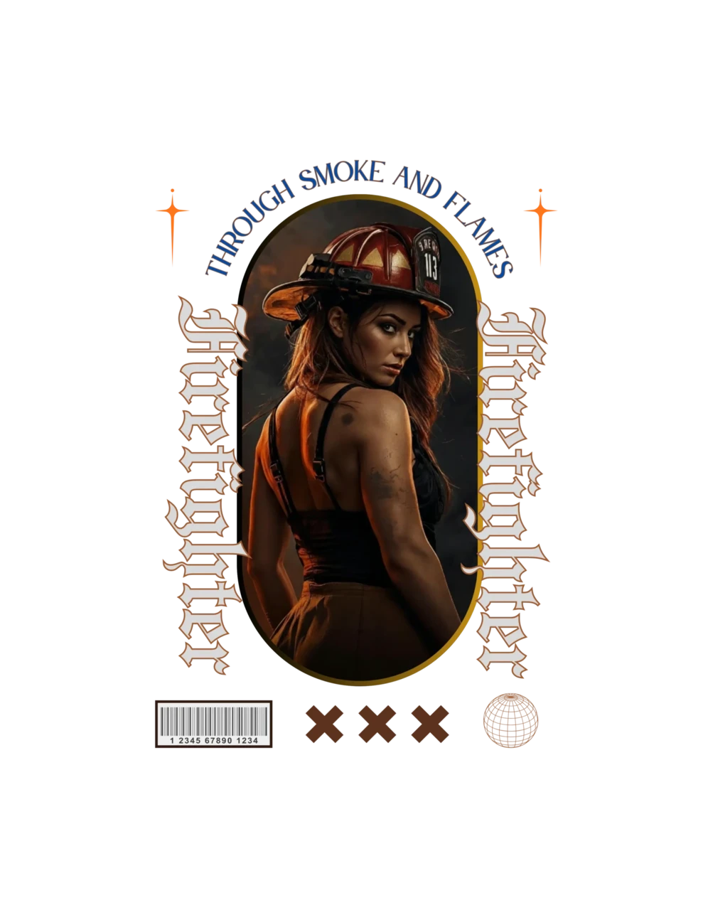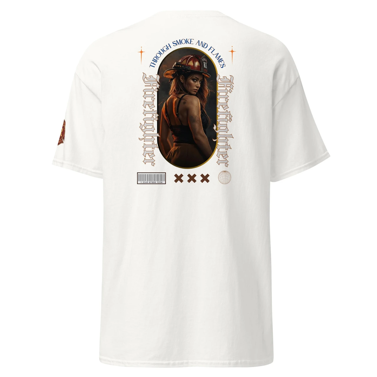 Moodne tüpograafia: Gooti-stiilis vertikaalne tekst "Firefighter" ja kaarjas ülaosa "Through Smoke and Flames" annavad disainile kaasaegse ja kalli high-end streetwear välimuse.