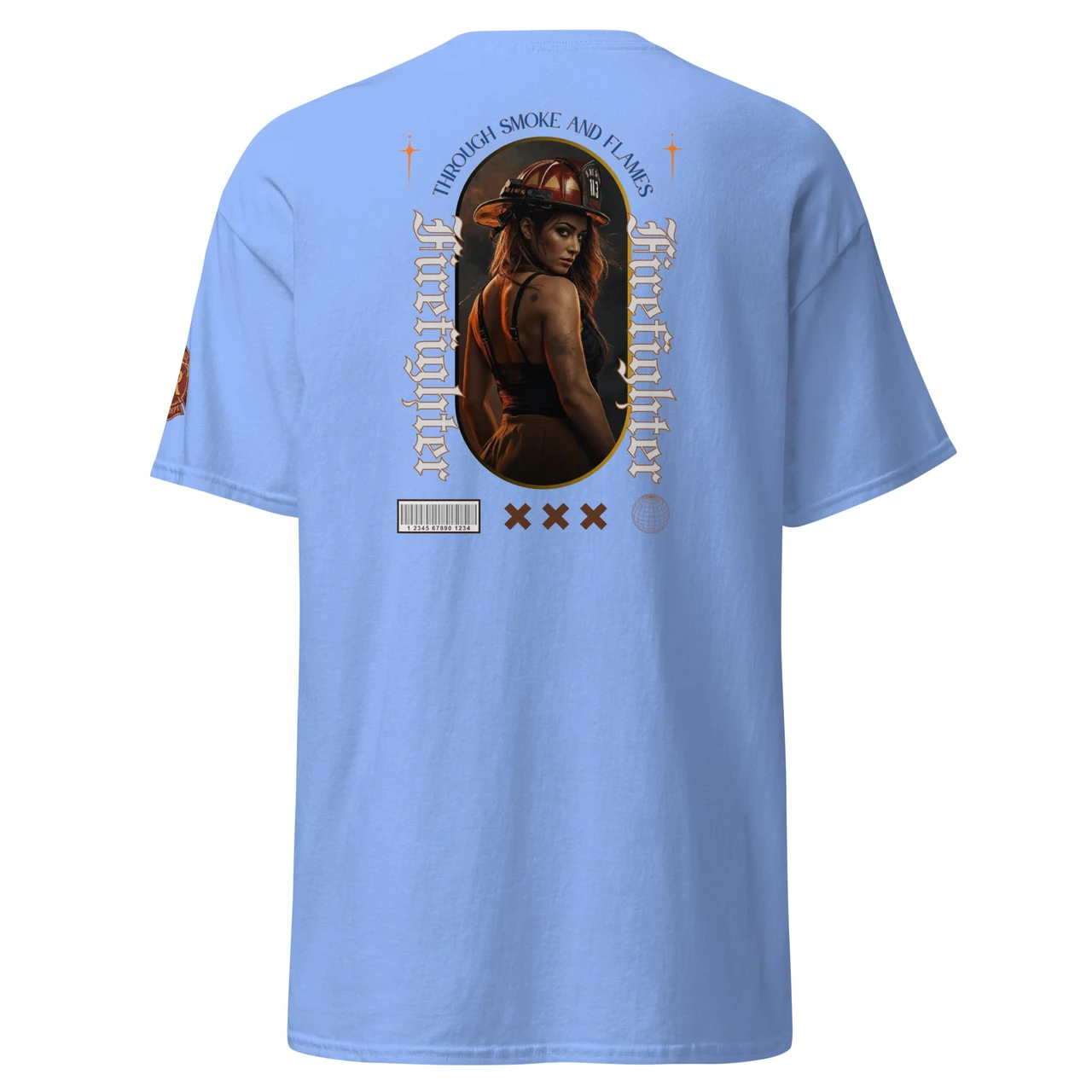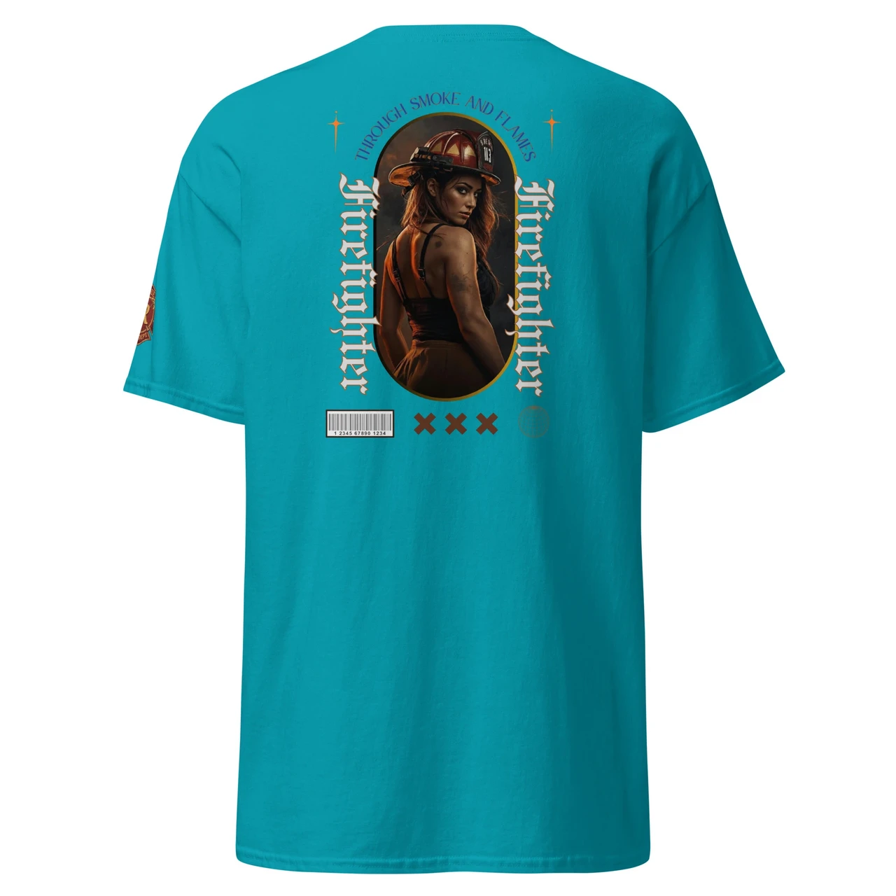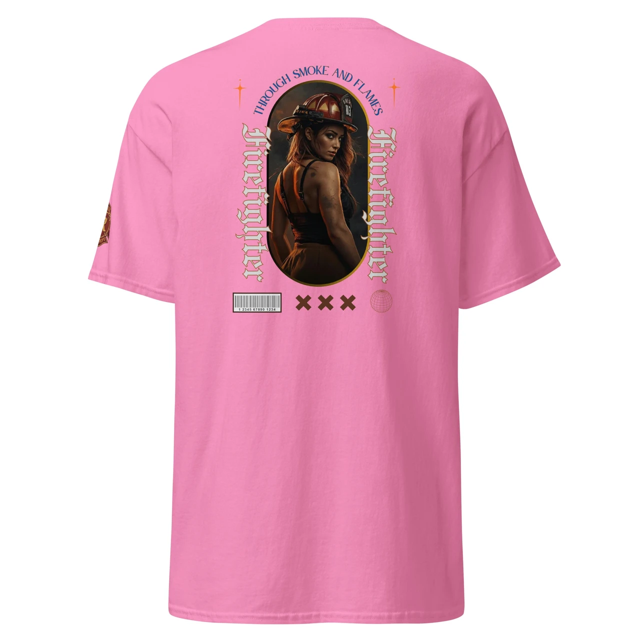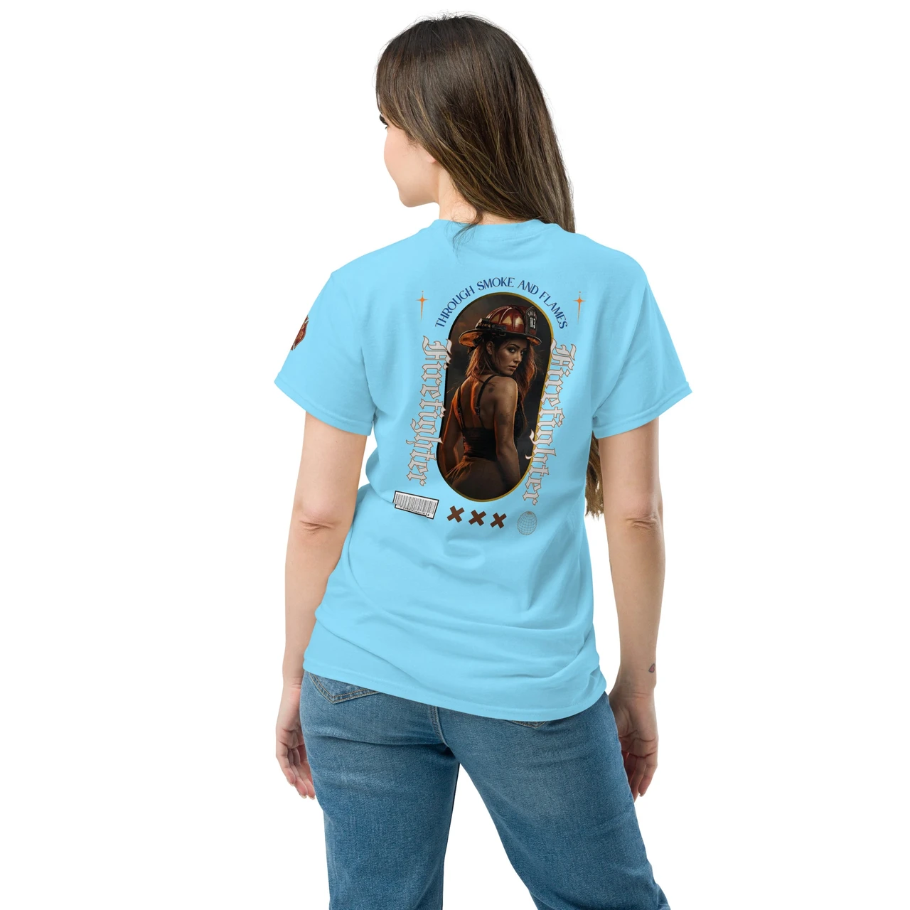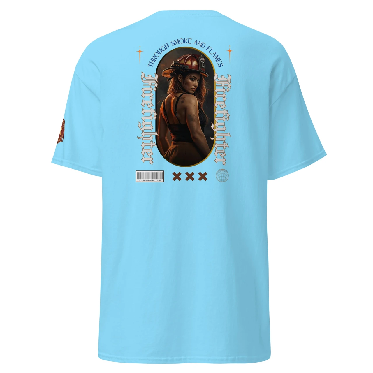 Moodne tüpograafia: Gooti-stiilis vertikaalne tekst "Firefighter" ja kaarjas ülaosa "Through Smoke and Flames" annavad disainile kaasaegse ja kalli high-end streetwear välimuse.