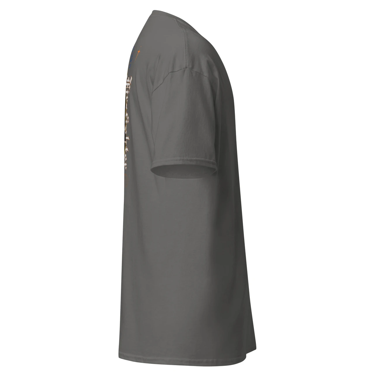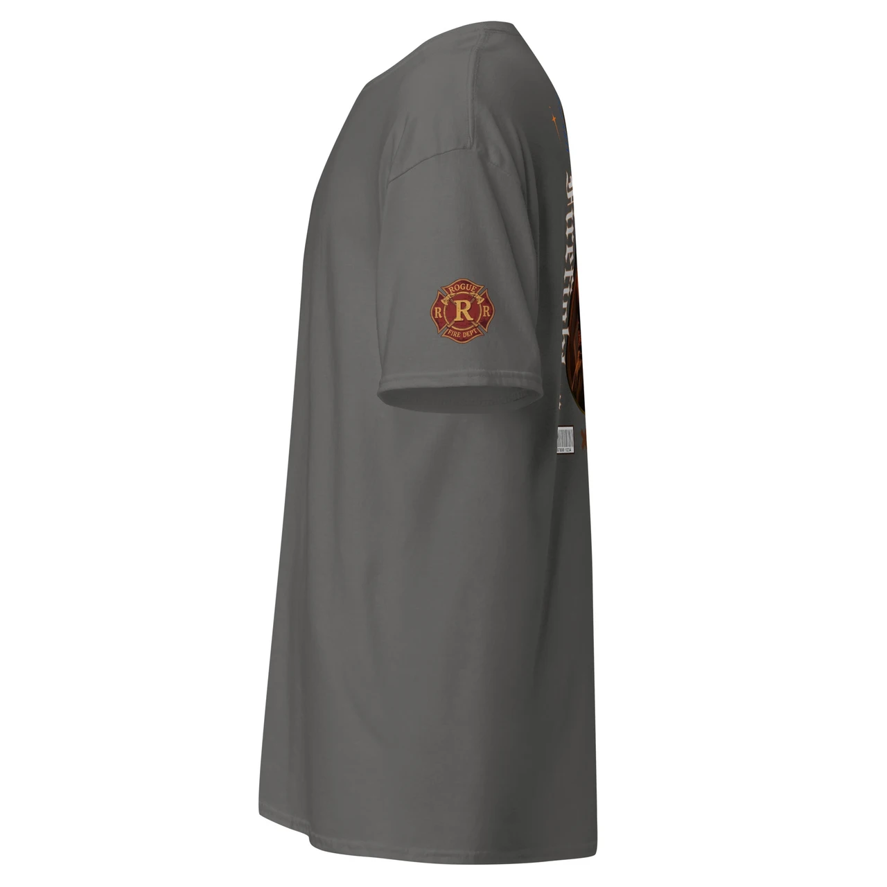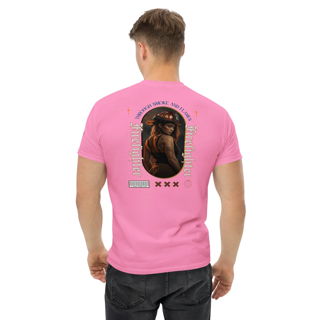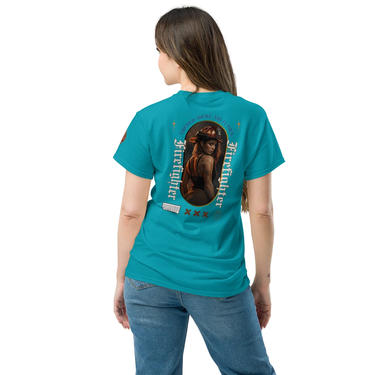 Moodne tüpograafia: Gooti-stiilis vertikaalne tekst "Firefighter" ja kaarjas ülaosa "Through Smoke and Flames" annavad disainile kaasaegse ja kalli high-end streetwear välimuse.